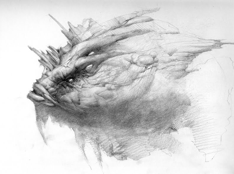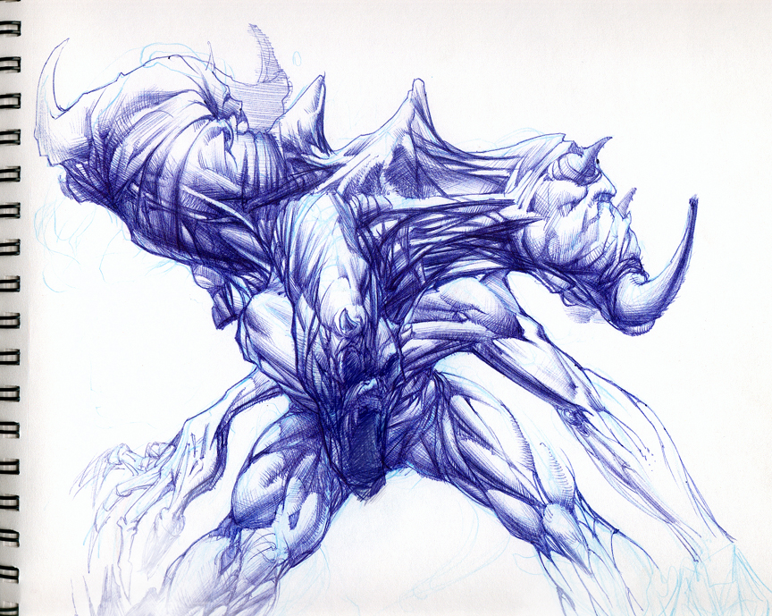 Here’s a little character I sketched using ball point pen, with a Col Erase Blue as a gesture to get rolling. No real game plan here other than I wanted to draw something with really outrageous horns. As the drawing progressed(or regressed:), I started to imagine that the horns themselves could be little sentient characters, perhaps indicators of the host’s mood. Maybe they’d stand at alert when alarmed, or pin themselves back when threatened, or even snap at each other in less active moments…who knows. It’s fun to build a little story around a sketch sometimes to try and give it a little more depth. This one’s in line for a redux, some anatomy and lighting I’d like to fix, but for now here’s something without any editing.