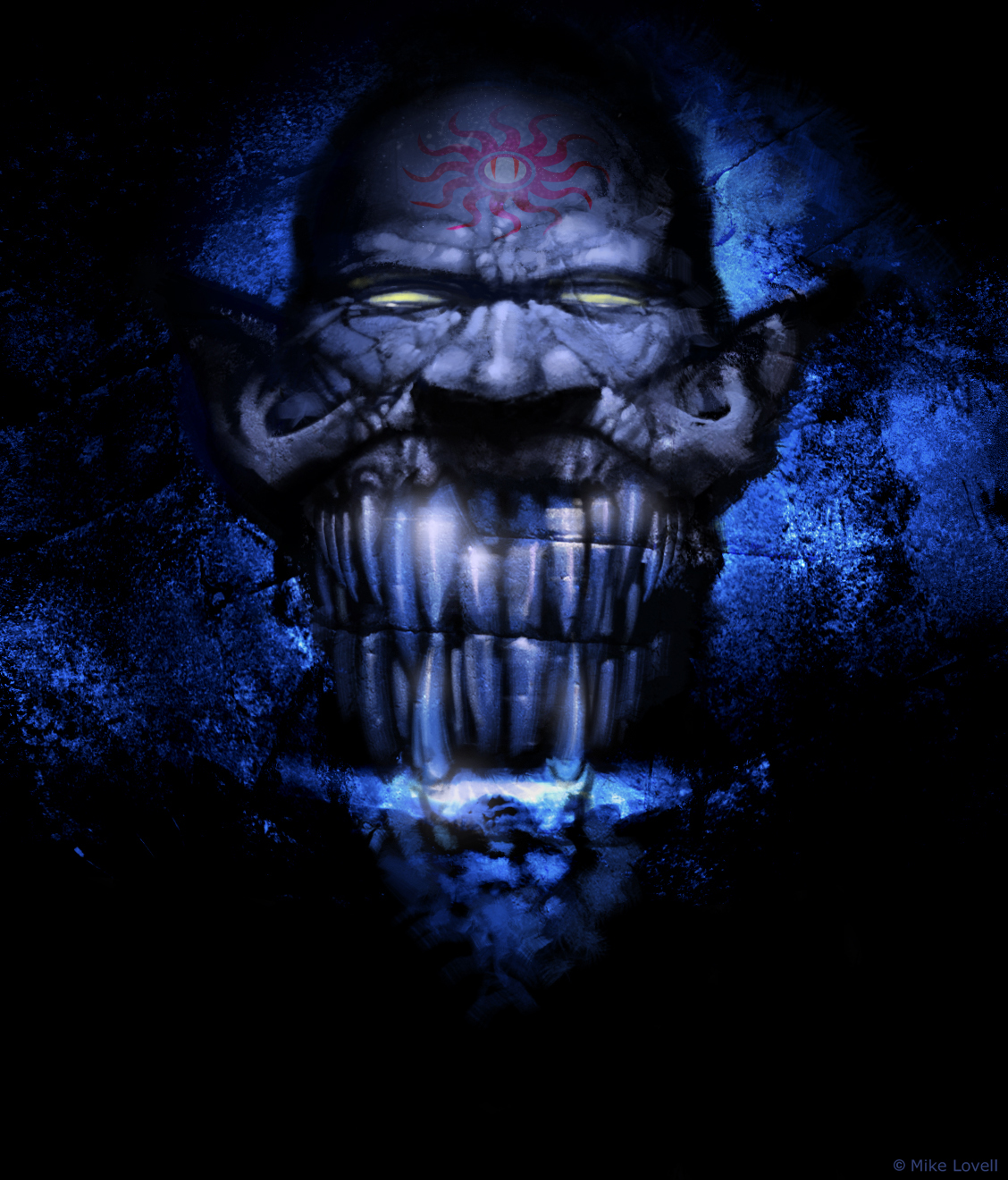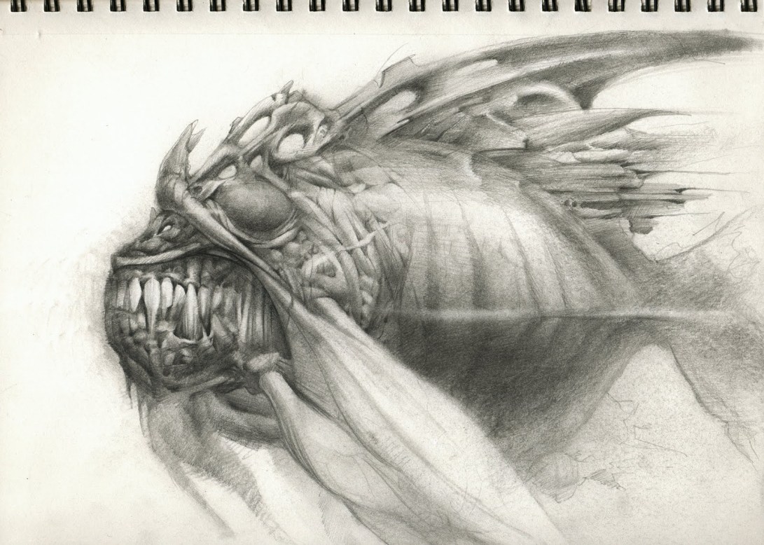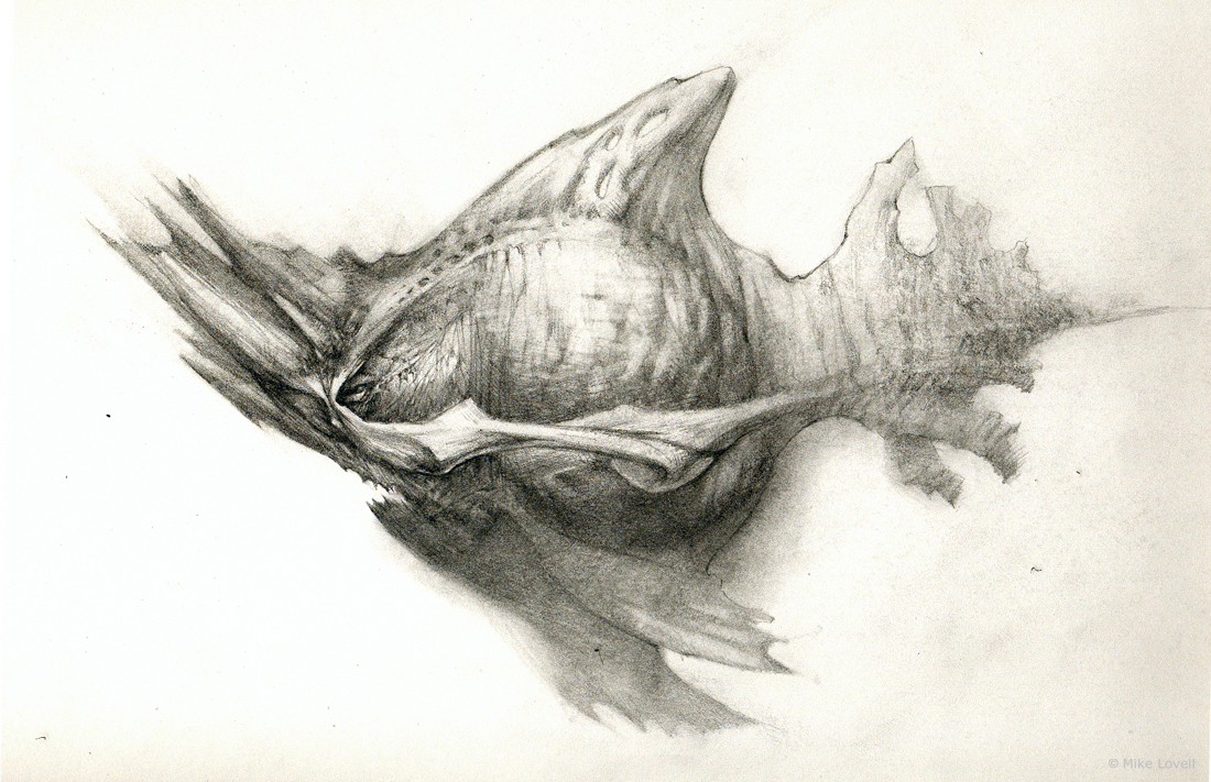 The first, and my favorite, of the fish series. More strange rock inspirations, along with insects that disguise themselves from predators. I tried to play with some silhouettes along the lines of confusion as to where the eye may actually be. For the record, it’s the little white speck just above all those imposing teeth, the rest of the faux eyes would be diversions to less important areas of the body. My imagination getting the better of me once again. Thx for dropping by.