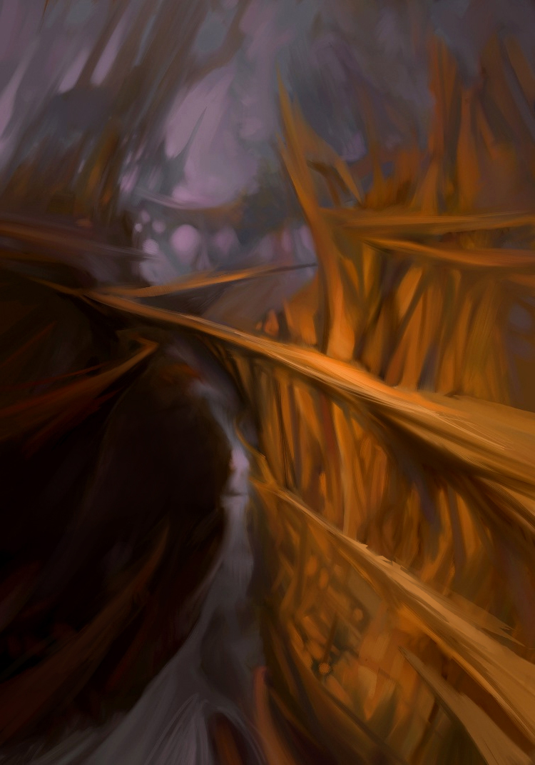 A little abstract landscape study, just experimenting with different shapes,depth, and trying to work fast. I think there’s a little bridge in there somewhere, though I’m not sure I’d venture over it:) Done in Painter IX using a gouache brush and the lasso tool to try and create some interesting shapes. I think I wrapped it up in just under a couple hours. As always, thanks for dropping by.